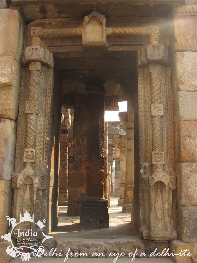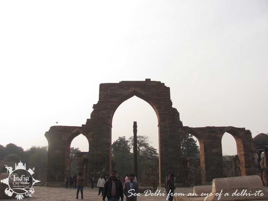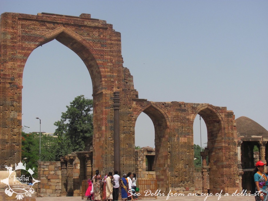 At the centre of the Quwwat-ul-Islam Mosque, stands the architectural marvel known as the Iron Pillar, a structure that has resisted corrosion through the last 1,600 years. The pillar may originally have been located elsewhere, but a ‘Delhi Walks’ discussion on the Pillar inscription will make it abundantly clear that it was placed on a hill called Vishnupada and may have been shifted to this location during Tomar times.